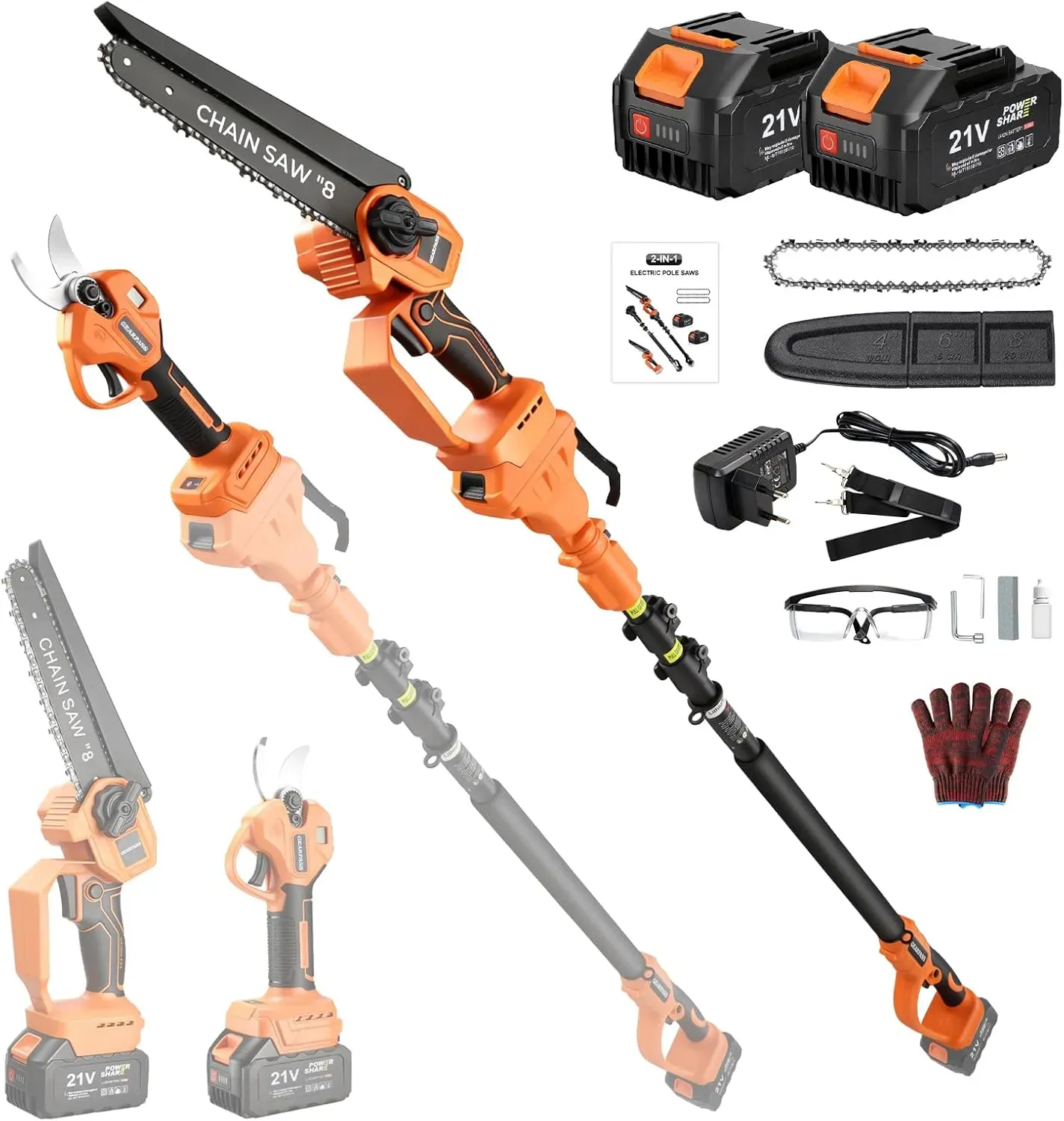 [Vielseitigkeit ohne Kabel] Stangensäge, Mini-Kettensäge, Astschere und Verlängerungsstange in einem Set. Geeignet für hohe Äste und bodennahe Schnitte.